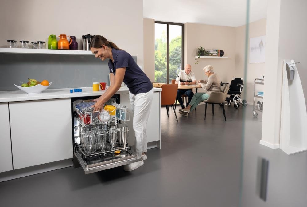 Mit hohen Spül- und Nachspültemperaturen ermöglichen gewerbliche Frischwasserspülmaschinen der Serie MasterLine von Miele beste Hygienebedingungen – etwa in Senioreneinrichtungen. (Foto: Miele)