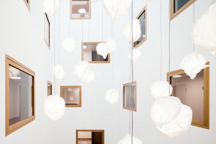 Die öffentlichen Räume sind einladend konzipiert und Korridore sind keine reinen Verkehrsflächen, sondern schaffen durch das Angebot von Sitzecken eine Atmosphäre, die dem institutionellen Ernst des Heimalltags entgegenwirkt und Begegnungen fördert. Die inneren Wege bekommen direktes Tageslicht und werden zusätzlich über zwei fünfgeschossige Lichthöfe in der Mitte des Hauses belichtet, so dass es im ganzen Gebäude keine dunklen Gänge und Korridore gibt.