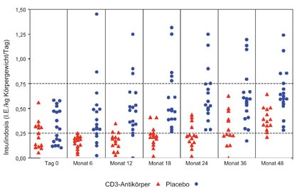 Nach sechstägiger Immuntherapie mit CD3-Antikörpern haben Typ-1-Diabetiker einen verminderten Insulinbedarf, wie eine aktuelle Studie zeigt. Die Insulindosis der Patienten, die den Antikörper erhielten, blieb im Gegensatz zur Placebogruppe ab dem Zeitpunkt der Manifestation stabil. Dieser Effekt konnte bis zu 48 Monate nach Immuntherapie nachgewiesen werden. In der multizentrischen internationalen Studie wurden 80 neu manifestierte Typ-1-Diabetiker untersucht. Eine Hälfte erhielt den CD3-Antikörper, die andere Hälfte ein Placebo. Die Forscher um Prof. Anette-Gabriele Ziegler konnten die neuen Ergebnisse an 33 Patienten aus der Verumgruppe und 31 Patienten aus der Placebogruppe beobachten, die an der 30-monatigen Studie teilnahmen. Die Wirkung der Immuntherapie war besonders in zwei Gruppen signifikant: in der Gruppe im Alter zwischen 12 und 27 Jahren und in der Gruppe mit einer C-Peptid-Sekretion von größer oder gleich der 50. Perzentile zum Zeitpunkt der Manifestation.