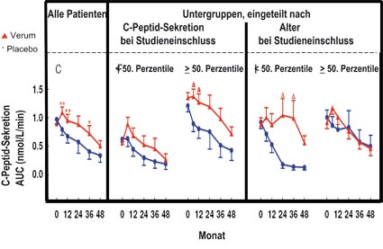 In der Subgruppe im Alter von 12 bis 27 Jahren mit Immuntherapie war die benötigte Insulindosis zu allen Zeitpunkten (Monat 24, 36 und 48) um bis zu 40% niedriger als in der Placebogruppe. Im Monat 24 nach Beginn der Studie wiesen diese jungen Patienten der Verumgruppe kaum höhere Insulindosen auf als bei Manifestation. Sie verfügten auch über bessere Langzeitblutzuckerwerte. Die Wirkung der Immuntherapie bei den jüngeren Patienten ist bis zum Monat 36 mit dem Erhalt der Betazellrestfunktion assoziiert - die korrespondierende Placebo-Gruppe verlor innerhalb der ersten 24 Monate 80% der Betazellmasse. Im Monat 48 hatten die jungen Patienten unter Antikörpertherapie 50% weniger Betazellmasse, der verbleibende Rest jedoch durchschnittlich immer noch fünf Mal größer als in der vergleichbaren Placebogruppe. Dennoch war dieser Unterschied nicht mehr signifikant. In der jüngeren Gruppe beobachteten die Forscher zudem eine bessere Stoffwechseleinstellung unter Immuntherapie. Einen Erhalt der Betazellrestfunktion in der Subgruppe unter Immuntherapie im Alter von 27 bis 39 Jahren konnten die Wissenschaftler nicht feststellen.