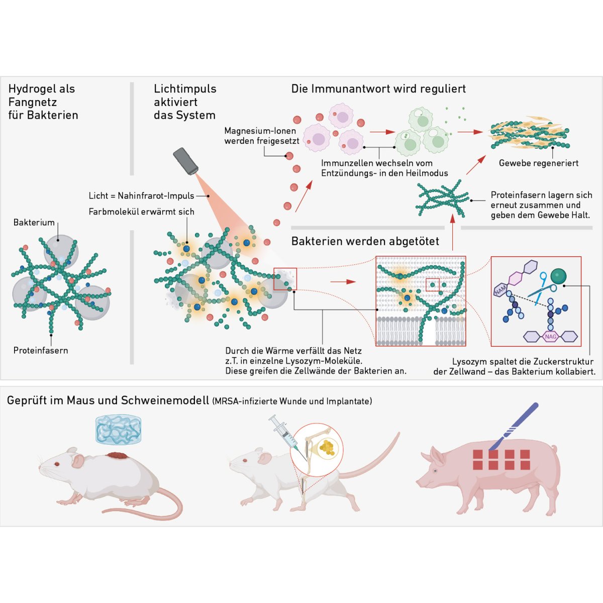Das Material wirkt wie ein Netz, das Bakterien einfängt und sie ausgelöst durch einen Lichtimpuls abtötet. In Tierversuchen zeigte das Gel eine starke Wirkung gegen den antibiotikaresistenten Keim MRSA und beschleunigte die Heilung von Wunden.