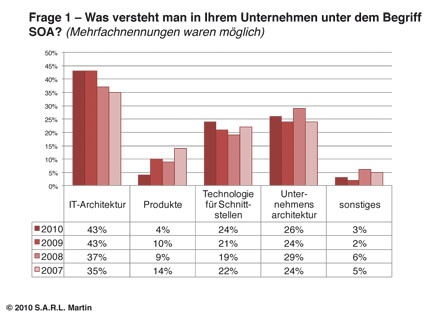 Seit vier Jahren erstellen die Marktanalysten ihren SOA-Check, der ein realistisches Bild über den Einsatz dieser Technologie in den Unternehmen unterschiedlichster Branchen geben soll. Die Ergebnisse der im Frühjahr 2010 gestarteten Umfrage sind vor Kurzem publiziert worden. Fazit: Das Konzept hinter einer serviceorientierten Architektur wurde verstanden und umgesetzt. Demzufolge steckt über die Hälfte der Befragten mitten in einem SOA-Projekt. 94% setzen bereits SOA ein oder planen den Einsatz.