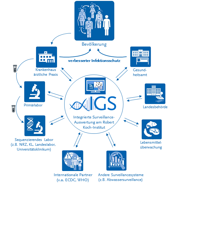 Neben der Suche nach Fallhäufungen und epidemiologischen Links zwischen Fällen können übereinstimmende genetische „Fingerabdrücke“ der Erreger helfen, Fälle Ausbrüchen zuzuordnen. Mithilfe der IGS konnten bereits zahlreiche Ausbrüche identifiziert werden, bei denen die Übertragung beispielsweise nicht in Deutschland, sondern im Ausland stattfand. In anderen Beispielen konnten Ausbrüche, die in unterschiedlichen Krankenhäusern auftraten, schnell verknüpft, Akteure zusammengebracht und letztlich Infektionsketten unterbrochen werden.