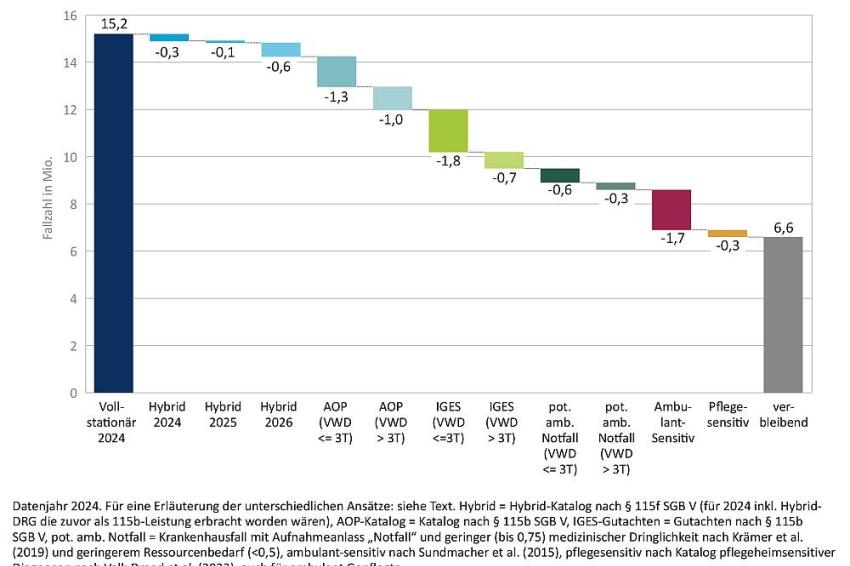 Die sechs in der Analyse berücksichtigten Ambulantisierungs-Ansätze sind die Hybrid-DRG-Kataloge der Jahre 2024 bis 2026 zur sektorengleichen Vergütung ambulanter Leistungen, der aktuelle Katalog ambulant durchführbarer Operationen und stationsersetzende Eingriffe in Krankenhäusern (AOP-Katalog), die in einem IGES-Gutachten von 2022 definierten zusätzlichen Leistungen zur Ergänzung des AOP-Kataloges, die potenziell auch ambulant behandelbaren stationären Notfälle mit relativ geringer medizinischer Dringlichkeit und geringem Ressourcenbedarf sowie vermeidbare Krankenhausfälle mit sogenannten „ambulant-sensitiven“ und „pflegesensitiven“ Haupt-Diagnosen.