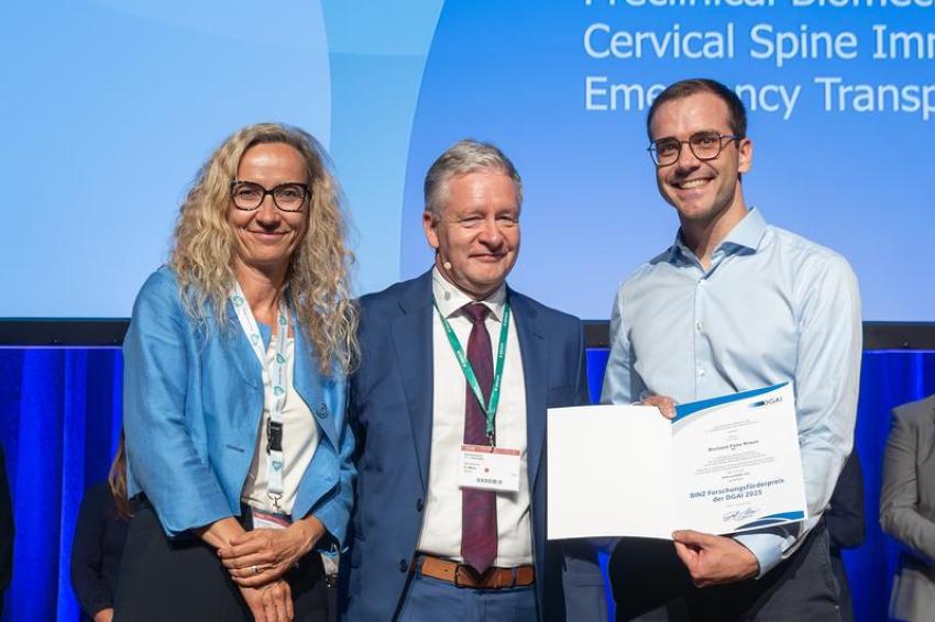03.11.2025 - Im Rahmen des Jahreskongresses der Deutschen Gesellschaft für Anästhesiologie und Intensivmedizin wurde der BINZ-Forschungsförderpreis 2025 an Dr. Richard Felix Kraus, Assistenzarzt der Klinik für Anästhesiologie des Universitätsklinikums Regensburg, verliehen.