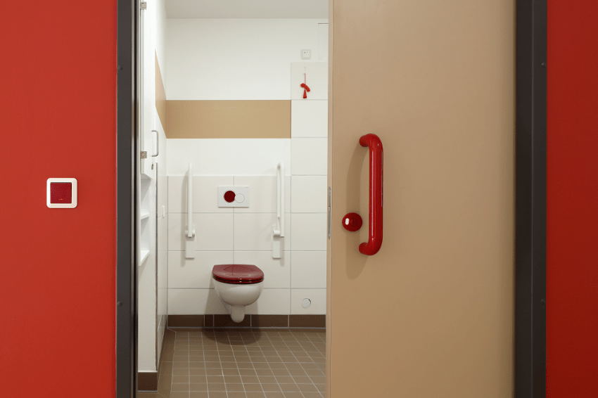 In dem für das Psychiatrische Pflegeheim in Liebenburg entwickelten Farb- und Materialkonzept dominieren im Innenbereich die Farben Grün und Rot. Daneben gibt es viel Weiß und helle, freundliche Holzakzente. Grüne Farbfelder und wechselnde Naturmotive aus dem Harz verleihen den um gemütliche Sitzmöglichkeiten erweiterten großzügigen, hellen Flurbereichen eine beruhigende Wirkung. Dem Grün steht das Rot gegenüber, das ebenfalls in der Natur zu finden ist und in der Demenz- und Geriatrieforschung als überdurschschnittlich gut wahrnehmbare Farbe gilt, wenn sie so wie hier kontrastreich eingesetzt wird. Rote Türbeschläge für die Zugänge zu den Bewohnerzimmern oder rot akzentuierte Schranktüren unterstützen die Orientierung ebenso wie die überdimensional großen Zahlen auf den Türen. Um eine schnelle Auffindbarkeit der WCs zu gewährleisten, wurden auch die Toilettendeckel, WC-Zugänge sowie Wandflächen der Sanitärbereiche in den Bewohnerzimmern mit roten Farbakzenten gestaltet.