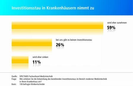Den Investitionsstau in deutschen Krankenhäusern beziffert Spectaris schon heute mit rund 50 Mrd.€, die Hälfte davon entfällt auf den Bereich Medizintechnik. Die Aussagen der Klinik-Entscheider lassen hier keine Verbesserung erkennen. 59% erwarten laut EMNID-Umfrage, dass sich die Situation verschärfen wird. Nur 11% gehen von einer Verbesserung aus, während ein Viertel der Befragten (26%) die Auffassung vertritt, es gebe in ihrem Krankenhaus keinen Investitionsstau im Bereich der Medizintechnik.