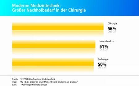 Den größten Nachholbedarf für eine moderne medizintechnische Ausstattung sehen die Befragten in der Chirurgie (56%), der Inneren Medizin (51%) und in der Radiologie (50%).