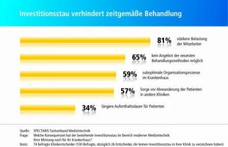 Als Konsequenz zeichnen die Krankenhaus-Manager, die einen steigenden Investitionsstau erwarten, ein düsteres Bild: 81% dieser Befragten sehen eine größere Belastung der Mitarbeiter. 65% der Krankenhäuser können ihren Patienten nicht die neuesten Behandlungsmethoden anbieten. In jedem zweiten Krankenhaus verlängerten sich somit außerdem die Behandlungsdauer der Patienten und als Folge auch der Aufenthalt im Krankenhaus (34%).