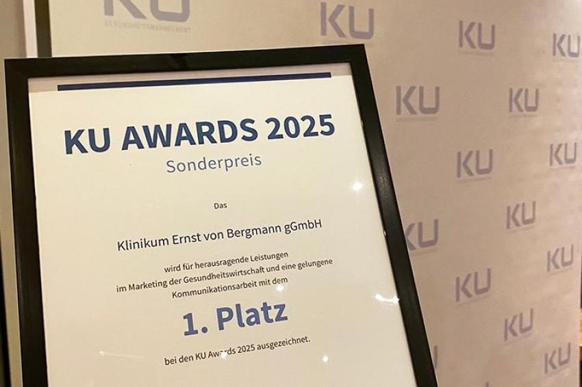 20.10.2025 - Das Klinikum EvB wurde in Berlin mit dem 1. Platz des renommierten KU Awards in der Kategorie „Sonderpreis“ ausgezeichnet. Die Auszeichnung würdigt die herausragende Ausstellung „Potsdam.Gesundheit.Zukunft. Eine Gesundheitsreise ins Übermorgen“, die das Klinikum anlässlich seiner Zukunftsinitiative konzipiert hat.