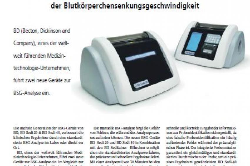 BD (Becton, Dickinson and Company), eines der weltweit führenden Medizintechnologie-Unternehmen, führt zwei neue Geräte zur BSG-Analyse ein. Die nächste Generation der BSG-Geräte von BD, BD Sedi-20 & BD Sedi-40, verbessert die klinischen Ergebnisse durch eine standardisierte BSG-Analyse im Labor oder direkt vor Ort.